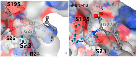 Action sites of L-valine in AHAS. (a) Action site of L-valine in M13 mutant AHAS; (b) action site of L-valine in wild-type AHAS.