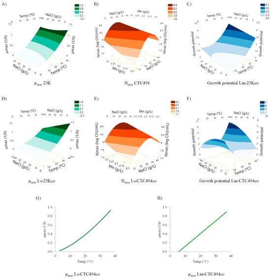 3.2. Impact of NaCl, Mn, Glucose, Temperature and Coculture in the Behaviour of L. sakei and L. monocytogenes