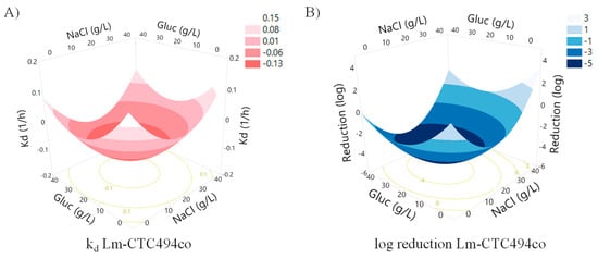 | Experiment | x1 | x2 | x3 | NaCl (g/L) | Mn (g/L) | T (°C) | Gluc (g/L) | Observed Reduction (log) 1 | Predicted Reduction (log) 1 | Observed kd (h−1) 1 | Predicted kd (h−1) 1 |