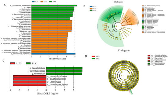 Linear Discriminant Analysis effect size (LEfSe) was further utilized to analyze the specific microbial community differences in each fermentation stage, as demonstrated in