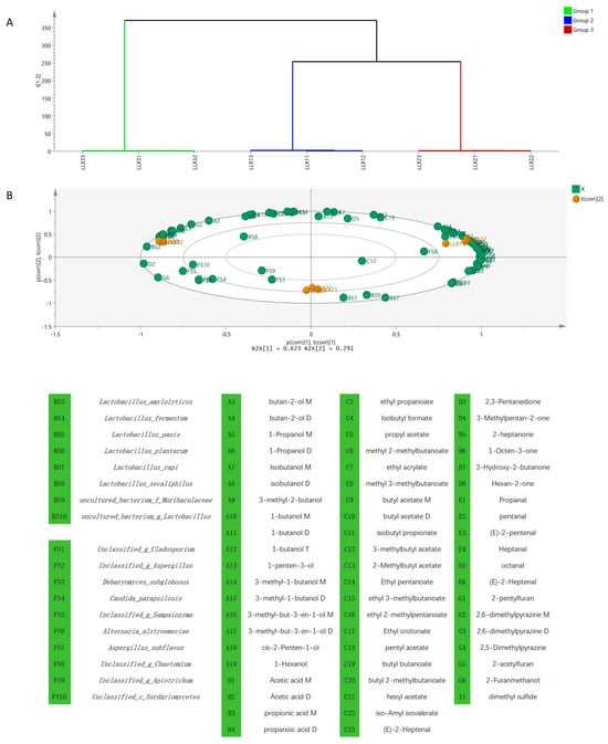 Figure 3B shows the results of PCoA analysis, which was conducted to compare and analyze the differences of samples at different stages of fermentation, using Bray-Curtis distance at the OTU level. The PCA of fungal data revealed that LLX1 was distinct from the other two, more advanced fermentation stages, with LLX2 and LLX3 showing good repeatability and similar sample data. The collective data within the group suggest that the experiment was highly consistent and that the results were dependable. PCA did not show optimal aggregation of fungal species. Thus, PCoA was carried out to exhibit enhanced aggregation of fungal colonies. The simultaneous application of both PCA and PCoA has been successfully applied elsewhere [