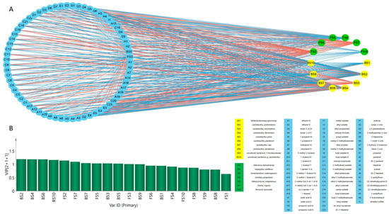 Figure 7A allows us to measure the degree of correlation between the microorganisms of any genus in the independent variable X and any volatile substance in the variable Y, with Cytoscape (version 3.7.2) providing a visual representation of these values. There was a strong correlation between nine bacterial species and seven fungal species with volatile compounds, and the correlation coefficient was |ρ| ≤ 0.7.