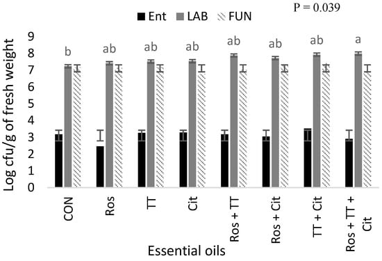 In terms of the microbial count, the LAB population increased (p = 0.039) when using the blend Ros + TT + Cit compared to the CON (Figure 1). However, the populations of enterobacteria and fungi were not affected (p > 0.05) by the essential oils or their blends (Figure 1).