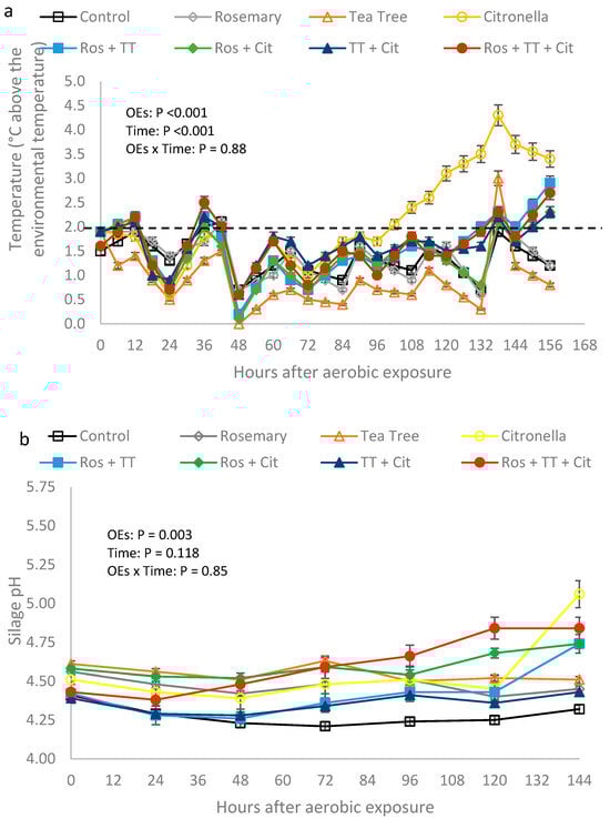 Regarding the aerobic stability, we observed that Ros increased (p < 0.001) the air exposure time of sorghum silage in 138 h (Figure 2a). Furthermore, the essential oils impacted the sorghum silage’s pH, which affected (p = 0.003) its aerobic stability (Figure 2b).