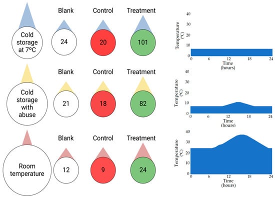 | Temperature Profile | Blank (Log cfu/g/Day) | Control (Log cfu/g/Day) | Treatment (Log cfu/g/Day) | |