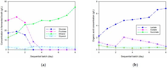 Figure 4b). In addition, the contents of succinic and acetic acids at the beginning of the fermentation were around 1 g/L and suffered a decrease in the final product to concentrations of 0.28 and 0.54 g/L, respectively (