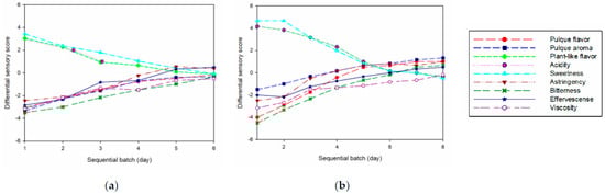 A sensory analysis test was carried out with 6 trained panelists, where the following sensory attributes were assessed: acidity, astringency, bitterness, sweetness, effervescence, plant-like flavor and viscosity, as well as the characteristic aroma and flavor of pulque. For these tests, samples of both the pulque inoculum and the semi-continuous fermentation samples throughout the bioreactor runs were evaluated using a numerical scale from 1 to 10. In order to assess the sensory parameters of the fermented product throughout the semi-continuous process, a comparative descriptive analysis test was carried out, taking the pulque inoculum as the reference. These results were plotted in terms of the sequential batch to show the dynamics of the comparative sensory scores indicated by negative or positive values as related to the reference. In addition, a spider plot of the sensory profile of the pulque inoculum and the final fermentation products of the reactor runs was performed to make a comparison between the sample’s sensory attributes.