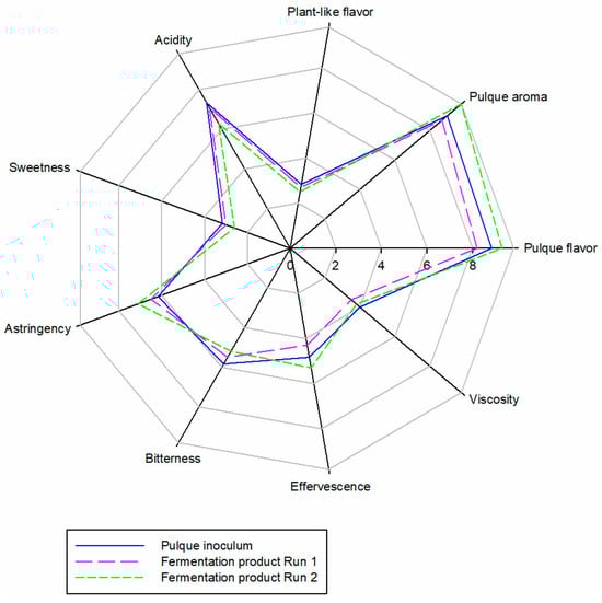 Figure 6. In the case of the reactor Run 1, the sensory characteristics were similar to those of the pulque seed, except for the characteristic flavor and aroma attributes, which were slightly below those of the inoculum. On the other hand, the pulque produced in the reactor Run 2, which was fermented for two additional days in comparison to Run 1, presented a greater intensity in the sensory parameters related to pulque, resulting in a product that was sensorially similar to the pulque inoculum. In conclusion, the sensory evaluation of the samples of the pulque products obtained through semi-continuous fermentation for the production of pulque resulted in minimal sensory differences with respect to the pulque seed, whereas a slight reduction in the bitterness attribute was observed.