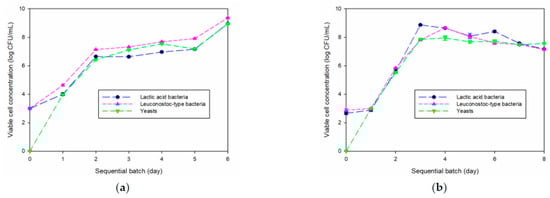 Figure 7), it could be observed that the initial bacterial concentrations were similar in both reactors; however, bacterial growth in the reactor Run 1 started from the fermentation Day 1, reaching a high concentration at Day 2 (6.7 log CFU/mL). Meanwhile, in Run 2, a lag phase seemed to have occurred, since the exponential growth started after 48 h; after which, a LAB maximum concentration (8.9 log CFU/mL) was achieved at Day 3 of the run. At the end of the fermentations (