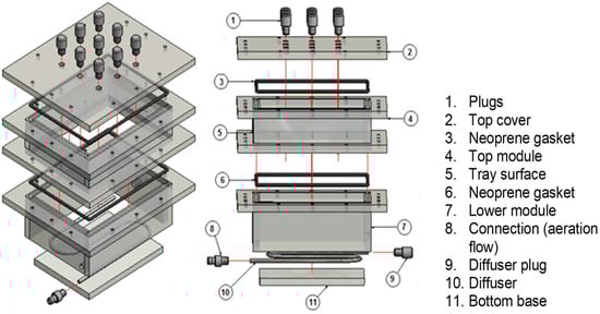 The tray was packed with pellets of a solid culture-based medium previously treated and containing 46.7% of fruit and vegetable by-products and 53.3% of soybean paste. The fruit and vegetable by-products were dehydrated before their use and, along with the soybean paste, were ground to homogenize the pellet size (1.41–1.68 mm). The tray was packed with 400 g of the moisturized fermentable solid mass (fruit and vegetable by-products, also referred to as AFBP throughout the document, and soybean paste). The fermentable solid mass, before being packed in the bioreactor, was moisturized with 240 mL of the mineral salt solution containing ions and micronutrients (as described below) required for the growth and metabolism of