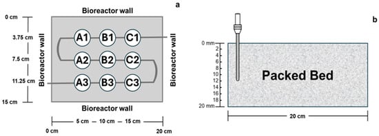 36] reported a 5 °C difference between the outlet (40 °C) and inlet (35 °C) temperatures when feeding air in a tubular bioreactor in the absence of microbial growth. During fermentation, temperature gradients caused increments in temperature in the packed-bed bioreactor, with lower temperatures at the bioreactor inlet. The lower part of the bed presented lower temperatures due to the convective mechanism and the lower temperature of the fed air, while at higher parts of the bed, convection was insufficient to remove metabolic heat.