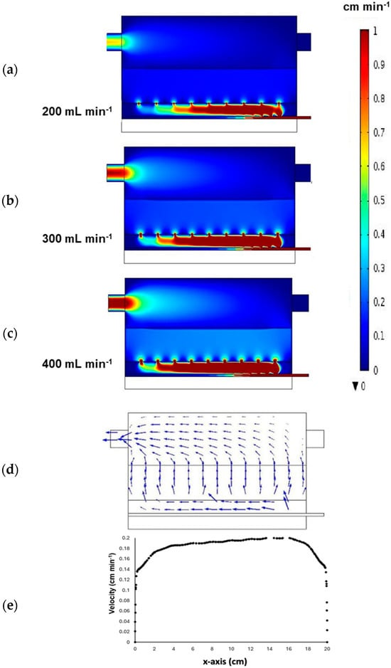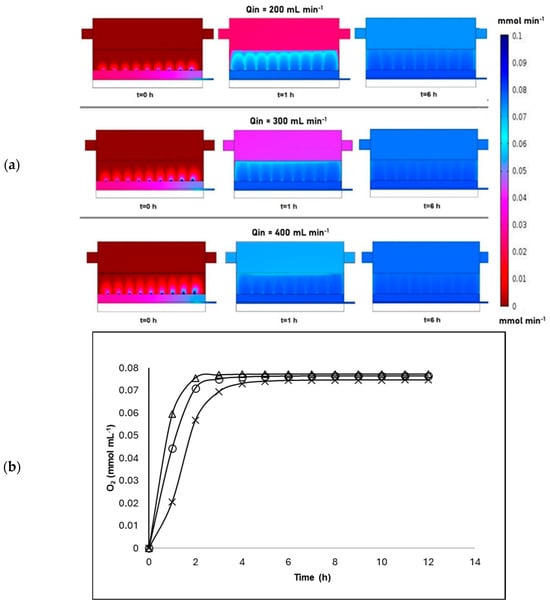 Figure 6b shows the average oxygen concentration obtained from the surface prediction in the packed region of the bioreactor as a function of time at the three inlet flow rates. Note that in these simulations, hydrodynamics was coupled to the mass transport equation under abiotic conditions. At any inlet flow rate, oxygen reached all zones within the packed region at the desired concentration, demonstrating that the oxygen distributor design worked as expected. Regarding the time for the oxygen concentration to reach a pseudo-steady state in the packed region, it took 2 h for the lowest inlet flow rate, while it took 4 h at the highest inlet flow rate due to the effect of the residence time, which is lower for the highest inlet flow rate. Although these simulations were obtained under abiotic conditions, as hypothesized, oxygen would be present before 4 h in the packed region at the studied inlet flow rates. This suggests that once the biological reactions initiate, there would be sufficient oxygen for their metabolic activity, appropriately accomplishing one of the challenges during SSF.