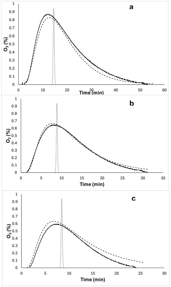 Figure 5. Observations were predicted properly considering experimental deviations. As the inlet flow rate increased, deviations were higher but acceptable, providing a clear idea of the effect of dispersion mechanisms in the transport of oxygen species in the bioreactor.