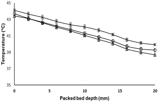 −1. Considering that temperature monitoring was carried out at the center of the bed, a packed-bed depth of 0 mm is located at the exit of the packed region (z = 20 mm), and a packed-bed depth of 20 mm is located at the start of the bed (z = 0 mm), while the coolant temperature was fixed at 45 °C and the inlet temperature of the bioreactor was fixed at 20 °C, the following can be identified: