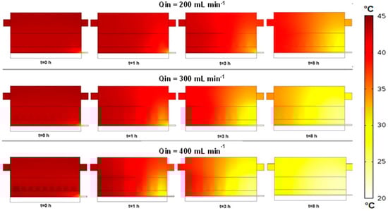 Figure 8 displays temperature surface plots obtained at different times (0–8 h) for the bioreactor when operated under various inlet flow rates (200–400 mL min