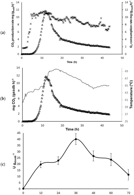Oxygen was consumed throughout the entire experiment by Yl2.2ab, with higher consumption observed in the range of 6 to 16 h (from 10 to 12 mg gssdb−1 h−1). The minimum consumption rate was observed before 6 h (from 2 to 10 mg gssdb−1 h−1). It is worth noting that appreciable consumption of oxygen was identified from 16 to 45 h (from 6 to 10 mg gssdb−1 h−1), even when the microorganisms had already entered the stationary phase. This trend in oxygen consumption during the biological process can be explained by the distinct phases of microbial growth and metabolism. Initially, in the lag phase, microorganisms adapt to their new environment, resulting in low oxygen consumption. As they transition to the exponential growth phase, their metabolic activity surges, leading to a significant increase in oxygen consumption. During the subsequent phase, as the microorganisms approach the stationary phase, nutrient decrement, associated with mass transport resistances or depletion, and product accumulation slow their growth or production rate of COCO2. Despite this, oxygen consumption remains considerable because the microorganisms continue to need oxygen for essential maintenance and cellular functions.