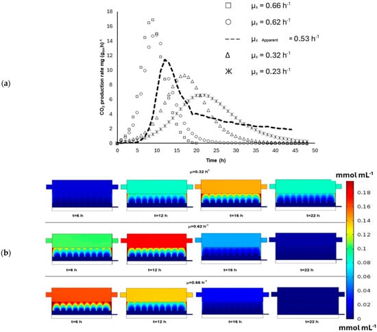 2 at earlier times, and vice versa. These simulations demonstrate the sensitivity of the bioreactor’s performance to variations in the maximum specific growth rate, stressing the need for the accurate characterization of transport phenomena and macroscopic kinetics. This will be essential for future novel designs of bioreactor technology for SSF using AFBP substrate-based packed beds.