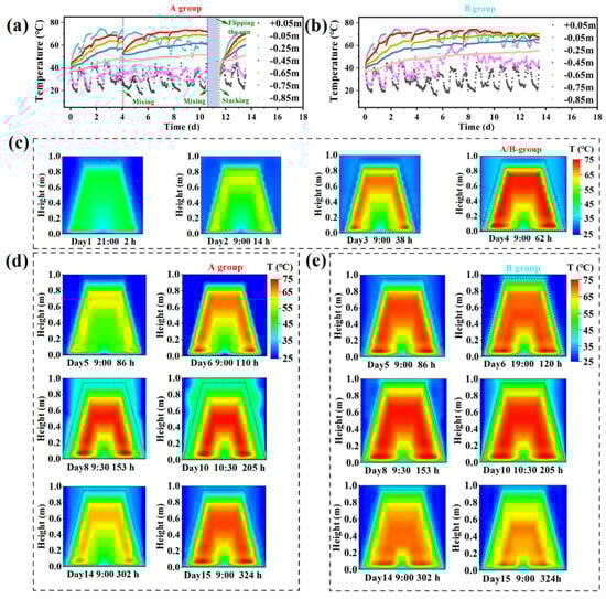 Temporal and spatial distribution of temperature during dairy manure fermentation. Time–temperature diagram showing the fermentation of dairy manure in the (a) A and (b) B groups; space–temperature diagram of fermentation during (c) 1–4 days and 5–15 days for the (d) A and (e) B groups.
