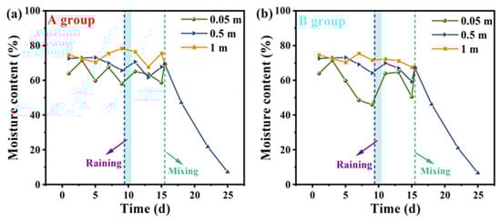Moisture content distribution during fermentation. (a) Time–moisture content change diagram of dairy manure in the A group. (b) Time–moisture content change diagram of dairy manure in the B group.