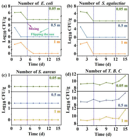 The number of bacteria in the recycled bedding produced by the A group was obtained by plate counting, as shown in Figure 4. As shown in Figure 4a, the number of E. coli at the beginning of fermentation was about 106 CFU/g, which is similar to the results of the work reported in [9]. E. coli was eradicated after 3 days at 0.5 m, quicker than that of 5 days at 0.05 m, and 7 days at 1 m, indicating that the middle layer had a better bactericidal effect. Llonch et al. reported the same result [32]. As shown in Figure 4b, the same change occurred in the superficial layer and middle layer of S. agalactiae, but the difference was that this species was eradicated on the fifth day in the deeper layer. S. aureus was not detected in the entire experiment (Figure 4c). The number of T. B. C was measured, as shown in Figure 4d. The number of T. B. C was about 109 CFU/g at the beginning, which is more than previously reported [9]. On the 12th day, the number of T. B. C sharply increased because of the breakdown and decay of cellulose to provide more nutrients. Therefore, 15 days of fermentation time is sufficient to achieve good sterilization. A fermentation time that is too long will make the manure rot, which is not conducive to improving bedding quality.