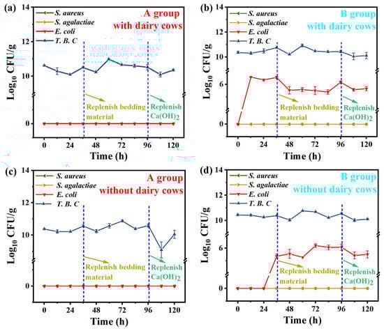 Changes in the number of Escherichia coli (E. coli), Streptococcus agalactiae (S. agalactiae), Staphylococcus aureus (S. aureus), and Total Bacteria Count (T. B. C.) with cow beds and without cow beds. (a) The A group dairy manure material in cow beds. (b) The B group dairy manure material in cow beds. (c) The A group dairy manure material without cow beds. (d) The B group dairy manure material without cow beds.