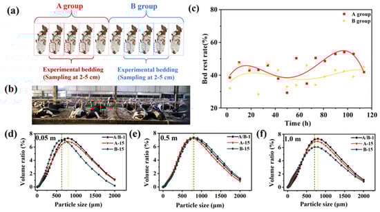 Bed rest rate and granularity statistics of the A and B groups of recycled dairy manure bedding materials. (a) Schematic diagram of the distribution of beds; (b) digital photos of dairy cows lying in beds; (c) bed rest rate of the A and B groups; (d) particle size changes at the different depths collected on (e) the 1st day and (f) the 15th day.