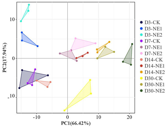 Principal component analysis of bacterial communities for stylo silage (CK: the control; NE1: 1% Neolamarckia cadamba leaf extracts; NE2: 2% Neolamarckia cadamba leaf extracts; D3, D7, D14, and D30 refer to being stored for 3, 7, 14, and 30 days, respectively).