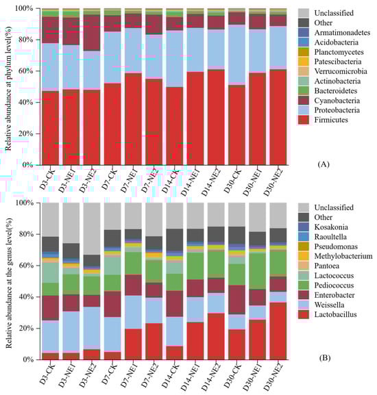 The distribution of bacterial communities based on their phylum (A) and genus (B) level. (CK: the control; NE1: 1% Neolamarckia cadamba leaf extracts; NE2: 2% Neolamarckia cadamba leaf extracts; D3, D7, D14, and D30 refer to being stored for 3, 7, 14, and 30 days, respectively).
