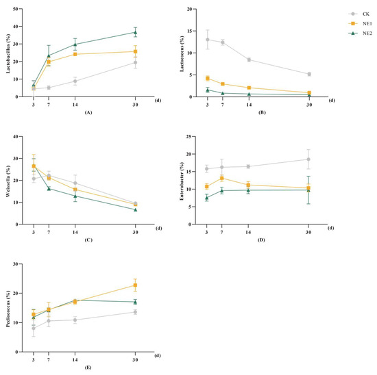 Changes in the relative abundance of five dominant bacterial genera. (A–E) represent changes in relative abundance of Lactobacillus, Lactococcus, Weissella, Enterobacter and Pediococcus, respectively. (d) represents storage days.