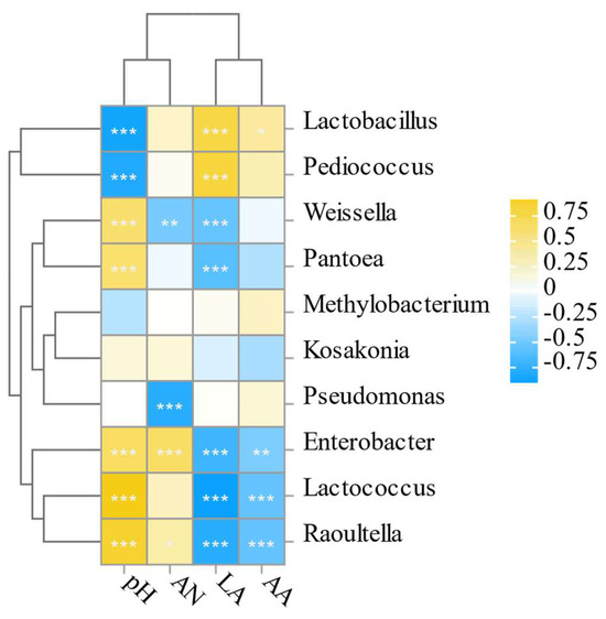 The correlation between microorganisms and fermentation parameters at the genus level. Corresponding value of middle heat map is Spearman correlation coefficient r, which ranges between 1 and −1; r < 0 indicates a negative correlation (blue) and r > 0 indicates a positive correlation (yellow). * significance at p < 0.05; ** significance at p < 0.01; *** significance at p < 0.001.