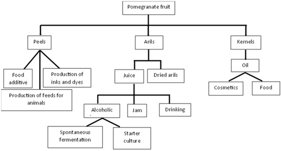 The pomegranate fruit is made up of three main parts: the peel, arils and kernels. All parts of pomegranate fruit can be processed into value-added products, as shown in Figure 2. The aril is the edible part of the fruit that contains the juice; it can be consumed fresh or dried or be converted to juice, which can further be converted into wine through the process of alcoholic fermentation [17,18,19,20]. Pomegranate peels can be used in the pharmaceutical industries as a supplement, in the food and beverage industry as a food additive, and in the production of ink/dye [5]. The kernels of pomegranate fruit are known to be the highest natural source of punicic acid; the kernel is rich in oil, which is used in the cosmetic industries for the formulation of beauty products and in pharmaceutical companies for the formulation of supplements [21].