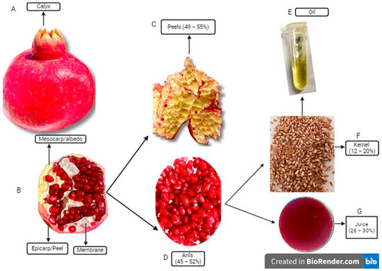Sections of Punica granatum L. fruit. (A) Whole fruit; (B) Longitudinal section of pomegranate fruit; (C) Epicarp/Peel; (D) Arils; (E) Oil; (F) Kernel/seed; (G) Juice.