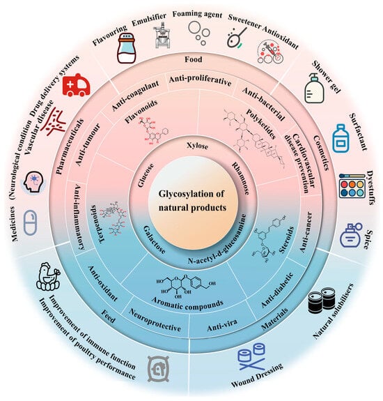 Glycosylation can significantly improve the physical and chemical properties and biological activities of many NPs, such as enhancing selectivity, solubility, stability, reducing the toxicity of compounds, enhancing pharmacological activity, and prolonging the duration of drug action []. The alteration of the sugar side chain structure in NPs has a significant impact on the activity, selectivity, and pharmacokinetic properties of the parent compound []. The addition of hydrophilic groups can make NPs more easily absorbed, thereby enhancing their pharmacological properties. Sun et al. [] reported that glycosylation is an important method for modifying various flavonoid compounds, with glycosides having higher solubility, stability, and bioavailability compared to the corresponding aglycone. The introduction of sugar moieties into non-glycoside compounds not only confers different molecular and spatial-electronic properties to NPs, but also the glycosylated modified NPs usually have a more stable structure. In recent years, the glycosylation of NPs has demonstrated attractive characteristics and a broad application prospect in new drug development. Glycosylation-modified NPs, such as Urdamycin [], Adriamycin [], Aclarubicin [], Erythromycin [], megalomycin C [], calicheamicin [], Staruosporine [], Vancomycin [], Digitoxin [,], Amphotericin B [], and rebeccamycin [], are important sources of drugs or drug precursors and are widely used in the pharmaceutical field. Glycosides have various applications in the treatment of respiratory diseases, lowering cholesterol, analgesic and sedative effects, preventing scurvy, and treating cancer []. Currently, glycosylated NPs are used as antibiotics (e.g., pikromycin, kanamycin, vancomycin), anti-tumors (e.g., kaempferol, apigenin), anti-inflammatories (e.g., quercetin), and antioxidants (e.g., naringenin). In addition to the pharmaceutical industry, glycosylated NPs are also widely used in the food, feed, cosmetics, materials, and other industries [].