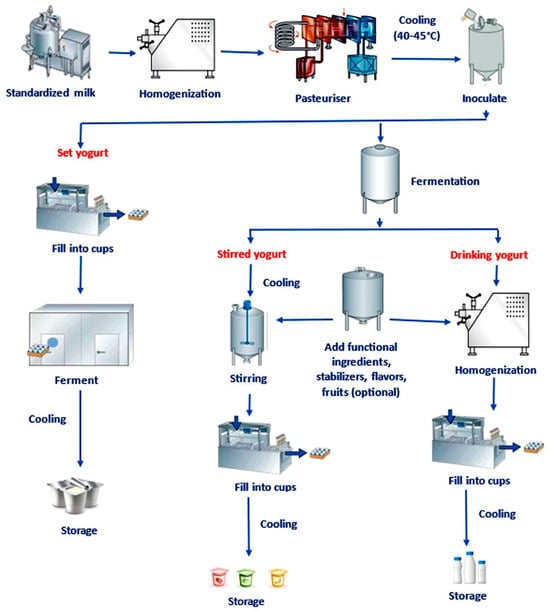 The detailed procedure explored by Nagaoka [] outlines the production of three types of yoghurt: set yoghurt, stirred yoghurt, and drinking yoghurt (Figure 1). These steps highlight variations in production, from the traditional set yoghurt to the less firm stirred yoghurt, and finally, the liquid drinking yoghurt enriched with stabilisers, sugars, and flavours.