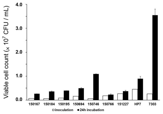 We evaluated and selected which bacteria can grow in CWG. Before incubation, the CWG extract was diluted to 5 brix using sterilized distilled water. To confirm that nine types of bacteria were growing in CWG, we measured the colony-forming unit (CFU), as shown in Figure 1. The initial inoculation CFU of bacteria was 1.78 × 106 on average and cultured for 24 h. After incubation, the CFU of all bacteria used in this experiment increased in 5-brix CWG. Among the bacteria used in the experiment, the strain with the lowest growth was Lactiplantibacillus plantarum strain KLDS (37.04% increase), and the one with the highest growth was Limosilactobacillus fermentum HY7303 (1265.38% increase). We selected Limosilactobacillus fermentum HY7303 (HY7303), which represented significant growth compared to the others in CWG medium, and used this strain in all subsequent experiments.