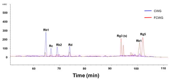 Representative HPLC chromatograms of the products analyzed in this study. Major ginsenosides Rb1, Rc, Rb2, and Rd were detected in high levels in CWG, and minor ginsenosides Rg3(s), Rk1, and Rg5 were detected in high levels in FCWG. CWG, cultured wild ginseng roots; FCWG, fermented cultured wild ginseng roots using HY7303.