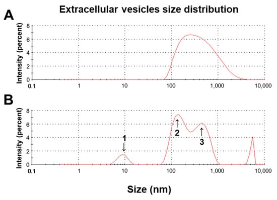 In this study, we used a nanoparticle size analyzer with zeta potential to determine the particle size of extracellular vesicles (EVs). We investigated the particle size distribution isolated from CWG (Figure 3A) and FCWG (Figure 3B). The size of nanoparticles isolated from CWG was distributed at 493.7 ± 435.9 (Table 5). And the size of nanoparticles isolated from FCWG was distributed with three peaks, 9.065 ± 1.98, 155.6 ± 51.5, and 459 ± 161.3. Thus, considering EVs have a size of 20 to 250 nm, relatively more EVs were detected in nanoparticles isolated from FCWG compared to CWG.