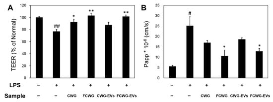 After the cells were grown to 100% confluence, the integrity of Caco-2 cell monolayers was assessed using a Millicell ERS volt–ohm meter (Merck Millipore Corporation, Darmstadt, Germany). Cell monolayers were used for experiments 21 days after seeding. Only cell monolayers with transepithelial electrical resistance (TEER) values exceeding 600 Ω/cm2 were selected for all co-culture experiments. This is a generally accepted value indicating the presence of a fully differentiated cell monolayer. Sample resistances were obtained using cell-free inserts as blanks, and blank values were subtracted from all samples. The final unit area resistance was then calculated by multiplying the sample resistance value by the effective transepithelial volume (0.33 cm2). To determine the effect of CWG and FCWG on cell barrier permeability, differentiated Caco-2 cell monolayers were washed twice with PBS and cultured in DMEM for 30 min. CWG and FCWG were diluted to a concentration of 10 μg/mL, and CWG-EVs and FCWG-EVs dissolved in DMSO were treated at 10 μg/mL with 1 μg/mL of lipopolysaccharides (LPSs, Sigma-Aldrich, St. Louis, MO, USA) for 24 h. In all subsequent experiments, cells were treated with the same concentration of LPSs and samples. TEER values were measured and recorded at selected time points (immediately after sample processing and 24 h after sample processing).