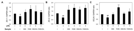 The effect of FCWG and its EVs on tight-junction proteins. The mRNA levels of (A) zonula occludens-1 (ZO-1), (B) zonula occludens-2 (ZO-2), and (C) occludin (OCLN) in cells were normalized to the levels of glyceraldehyde 3-phosphate dehydrogenase (GAPDH) mRNA and calculated as a relative-fold value. Error bars represent standard deviation of the mean (n = 3). Significant differences are indicated by * p < 0.05 and ** p < 0.01, relative to the LPS group. # p < 0.05, ## p < 0.001 compared with normal group. In order from left to right: normal, LPS, CWG, FCWG, CWG-EV, and FCWG-EV group (LPSs; 1 μg/mL, CWG; 10 μg/mL, FCWG; 10 μg/mL, CWG-EVs; 10 μg/mL, FCWG-EVs; 10 μg/mL). CWG, cultured wild ginseng roots; FCWG, fermented cultured wild ginseng roots using HY7303; EVs, extracellular vesicles.