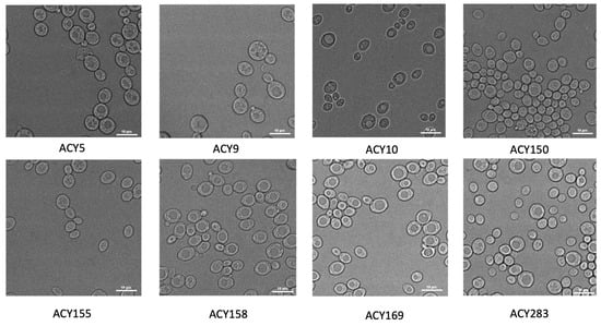 Yeast strains were grown in YPD medium (1% yeast extract, 2% peptone, 2% dextrose) until the stationary phase. Cultures were inoculated into 5 mL of YPD and incubated at 30 °C with shaking at 200 RPM. After reaching the stationary phase, cultures were diluted 1:10 with sterile distilled water. Then, 2 µL of the diluted culture was placed on a microscope slide and covered with a coverslip. Slides were observed under a microscope at 400× magnification, and images were captured using an Olympus BX51 microscope (Olympus Corporation, Tokyo, Japan) with a digital camera (Figure 1). Images were processed with ImageJ software 1.54J for clarity and consistency.