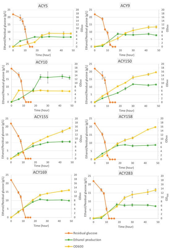The fermentation profiles of the tested yeast strains are summarized in Table 1, and the fermentation kinetics are illustrated in Figure 2. ACY5 and ACY150 showed efficient glucose utilization with moderate ethanol yields and minimal to moderate pH changes, indicating balanced fermentation profiles suitable for general use. ACY150, in particular, had one of the highest ethanol production rates (0.255 g/L/h). ACY9 demonstrated a glucose consumption rate of 0.661 g/L/h and produced ethanol at a rate of 0.236 g/L/h, accompanied by the most substantial pH drop (1.947). This suggests a robust fermentation profile with significant acidification.