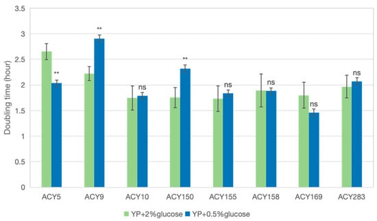 Doubling times of yeast strains under glucose-rich and glucose-limited conditions. The green bars indicate the doubling time in glucose-rich conditions (YP medium with 2% glucose), and the blue bars show the doubling time in glucose-limited conditions (YP medium with 0.5% glucose). Error bars represent the standard deviation from the mean. Statistical significance between conditions for each strain is denoted by asterisks (** p < 0.01), with ‘ns’ indicating no significant difference.