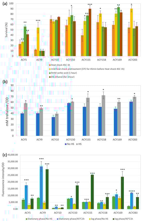 Following heat shock treatment, most yeast strains exhibited an increase in intracellular trehalose levels (Figure 4b). This observation typically suggests a stress response, positioning trehalose as a potential indicator of cellular stress levels. However, the direct role of trehalose as a protective molecule against heat shock has not yet been definitively established []. While some strains with heightened trehalose showed improved survival, others like ACY10 maintained viability without a significant rise in trehalose, indicating that survival post heat shock may not be solely reliant on this molecule. Previous studies suggested that while intracellular trehalose levels are directly associated with freeze–thaw tolerance and correlate with freeze–thaw tolerance in yeast, the attributed physiological functions of trehalose, such as heat resistance, may not be directly related to its presence [,]. Many of the metabolic and growth defects associated with mutations in the trehalose biosynthesis pathway are not abolished by providing abundant intracellular trehalose. Therefore, the relationship between trehalose levels and cell survival under heat stress invites further scrutiny to ascertain whether trehalose indeed acts as a protective agent or merely marks the occurrence of cellular stress.