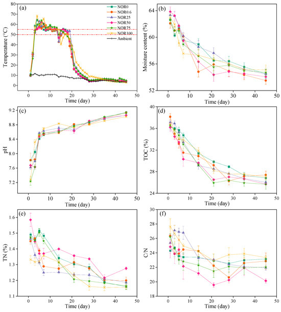 Dynamic changes in the temperature (a), moisture content (b), pH (c), TOC content (d), TN content (e), and C/N (f) during the composting process. Results are the mean of three replicates; bars indicate the standard error. TOC: total organic carbon; TN: total nitrogen; NOR0: no norfloxacin; NOR0.6: spiked with 0.6 mg kg−1 of norfloxacin; NOR25: spiked with 25 mg kg−1 of norfloxacin; NOR50: spiked with 50 mg kg−1 of norfloxacin; NOR75: spiked with 75 mg kg−1 of norfloxacin; NOR100: spiked with 100 mg kg−1 of norfloxacin, similarly hereinafter.