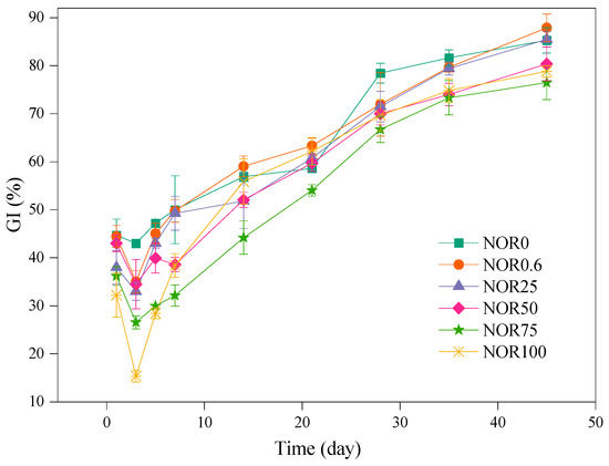 The GI is a sensitive indicator that can reflect the maturity and phytotoxicity of composting by observing the effects of compost products on seed germination rate [39]. The GI of each treatment showed a trend of unabiding decrease and then continuous increase (Figure 2). The piles of all treatments possessed high biotoxicity, with GIs of 44.70% (NOR0), 44.47% (NOR0.6), 37.97% (NOR25), 43.02% (NOR50), 36.21% (NOR75), and 32.25% (NOR100). During the first three days of composting, the GI showed a more obvious decrease in the treatment containing the higher concentration of norfloxacin. There may be two reasons for this phenomenon. One is that norfloxacin itself aggravates the biological toxicity of the compost, and the other is that norfloxacin mobilizes microbial activity, producing more poisonous substances like NH3, volatile fatty acids (VFAs), and phenols [21]. After the thermophilic stage, the GI of all treatments increased visibly to above 50%. At the end of composting, the GI of each treatment (NOR0, NOR0.6, NOR25, NOR50, NOR75, and NOR100) is 85.27%, 87.87%, 85.49%, 80.38%, 76.47%, and 78.81%, respectively. However, compost products of all treatments satisfied the standard requirement of NY/T 525–2021, which is supposed to have a GI of at least 70%. Just two treatments containing norfloxacin (NOR0.6 and NOR25) had nonsignificantly different GIs from the control, indicating that the low concentration of norfloxacin (≤25 mg kg−1) had no negative influence on the release of phytotoxicity. A similar result was reported by Shi et al. (2016) [40], which also reported that tetracycline at elevated levels of up to 500 mg/kg would hinder the maturity of the feces compost and the release of phytotoxicity.