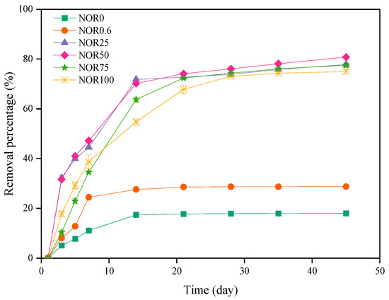Composting can effectively remove antibiotics such as tetracyclines, sulfonamides, fluoroquinolones, and macrolides from manure [41,42,43]. The variation in norfloxacin in the composting process is illustrated in Figure 3. In consideration of the great contribution of the thermophilic phase to the elimination of antibiotics, we compared the removal efficiency of norfloxacin in different treatments during the first 14 days of composting. Overall, the norfloxacin removal of each treatment increased to a different extent over time. On day 14, the removal rates of norfloxacin in these treatments were 18.01% (NOR0), 28.77% (NOR0.6), 71.84% (NOR25), 70.17% (NOR50), 63.72% (NOR75), and 54.73% (NOR100), respectively. Then, all treatments presented an obvious slowdown in norfloxacin degradation. At the end of composting, norfloxacin in all treatments decreased by 18.01% (NOR0), 28.77% (NOR0.6), 77.86% (NOR25), 80.78% (NOR50), 77.48% (NOR75), and 75.00% (NOR100), respectively. The results showed that norfloxacin in the NOR0 and NOR0.6 treatments was not completely degraded as hypothesized, which probably was because trace norfloxacin would be adsorbed by macromolecular organic matter in the compost [14]. The absorption in compost involves several mechanisms, like sorption, complexation, and co-precipitation, which could negatively influence the biodegradation of antibiotics. Sun et al. (2022) [13] thought the fate of antibiotics was not determined only by high temperature and biodegradation but also by adsorption during the composting process. Meanwhile, the degradation rate of norfloxacin in the other four treatments appeared to have a decrescent tendency with the higher concentrations of norfloxacin. The reason was that the selective pressure of excessive norfloxacin would induce the accelerating spread of resistant bacteria in the compost [44].