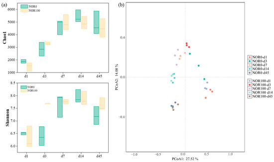 To evaluate bacterial alpha diversity, the Chao1 and Shannon indexes were utilized to assess bacterial community richness and diversity, respectively [48]. As presented in Figure 4a, the Chao1 and Shannon indexes in two treatments show trends of increasing at first and then slightly decreasing during composting, which is probably related to the availability of nutrients involved in microbial reproduction. In contrast to the control, the NOR100 treatment had lower bacterial richness and diversity at the initial phase of composting but higher richness and diversity than NOR0 at the thermophilic phase. This is because the presence of norfloxacin stimulates the growth and reproduction of thermophilic bacteria to a certain extent. During the whole composting process, there were no statistically significant differences observed in bacterial richness and diversity between the NOR100 and NOR0 treatments, which indicated that norfloxacin had no evident influence on bacterial alpha diversity. A similar result was also observed by Zhao et al. (2022) [49].