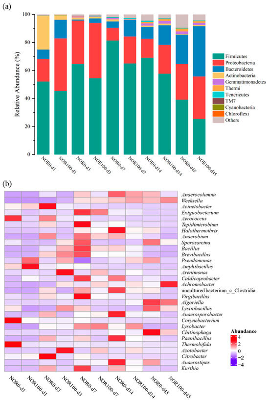 Moreover, the bacterial community structure at the phylum and genus levels during composting is illustrated in Figure 5. The dominant four phyla were Firmicutes, Proteobacteria, Bacteroidetes, and Actinobacteria (Figure 5a), which accounted for 86.19–99.01% in NOR0 and 92.54–99.42% in NOR100 throughout the composting process. And the top 30 most primary genera in both treatments all belonged to four dominant phyla. These frequently observed phyla are consistently documented as dominant players in the composting process due to their inherent affiliation with the degradation of macromolecular organic matter during composting [13,22,50]. In both treatments, the relative abundance of Firmicutes increased to the peaks of 65% (NOR0) and 81% (NOR100) on day 7 of composting, respectively, and then gradually decreased. The variation for Firmicutes was consistent with the thermophilic period of composting, attributed to their tolerance of high temperatures through spore formation [13,51]. Most of the top 30 genera were members of Firmicutes, in which Exiguobacterium, Tepidimicrobium, Bacillus, and Virgibacillus presented the highest relative abundance on day 7 than on other periods.