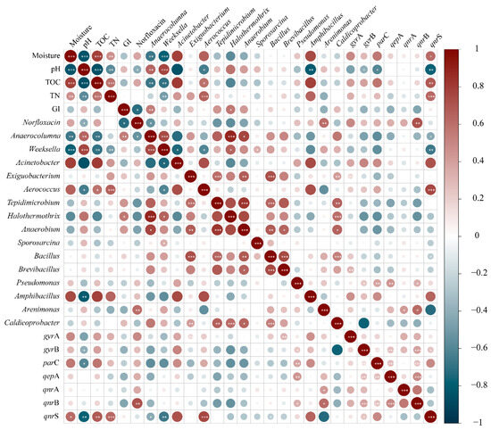 To further find out the effect of physicochemical properties, norfloxacin, and bacterial community on targeted ARG evolution during composting, a correlation analysis was conducted, as shown in Figure 6. In this study, there were no obvious correlations (p > 0.05) between physicochemical properties (moisture content, pH, TOC, and TN) and most of the targeted ARGs. Only qnrS was positively associated with moisture content (p < 0.05), TOC (p < 0.01), and TN (p < 0.001) and negatively associated with pH (p < 0.01). Meanwhile, qnrS had a significantly positive correlation with Aerococcus (p < 0.001). Meanwhile, the other six ARGs all had significant positive correlations with specific genera. Concretely, gyrA was notably correlated with both Exiguobacterium and Brevibacillus; gyrB, parC, and qepA were associated with Pseudomonas, while qnrA and qnrB were correlated with Arenimonas. It was deduced that Aerococcus, Exiguobacterium, Brevibacillus, Pseudomonas, and Arenimonas were the dominant host bacteria of ARGs. The composting physicochemical properties indirectly influenced the profiles of ARGs by exerting changes on the bacterial community. The ARGs were spread among bacterial communities throughout plasmid-mediated horizontal gene transfer [56,57]. Consequently, as an economically and technically feasible method for resource utilization of animal manure, composting should be ameliorated through meticulous management like the adjustment of moisture content, pH, and C/N, which is vital for ensuring the activities of microorganisms and the efficient elimination of ARGs. Moreover, precautions like the promotion of antibiotic alternatives should be taken to hinder the abuse of antibiotics and prevent antibiotics from entering the environment to reduce the risk of bacteria developing antibiotic resistance.