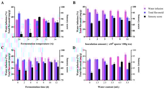 An appropriate temperature is conducive to the moist heat effect, the enzymatic activity and microbial metabolism, which can prevent the growth of harmful bacteria and, finally, improve the overall quality of tea. As shown in Figure 1A, with the increase in temperature from 20 °C to 36 °C, the content of water infusion in fermented tea water increased mildly, while the total flavonoid content decreased significantly. The results indicated that high temperatures promote the enzyme activity of E. cristatum and the substance conversion rate. The highest sensory evaluation score was achieved at 28 °C, which is the most suitable temperature for E. cristatum growth reported previously []. Therefore, the fermentation temperature was set at 28 °C for the subsequent experiments.